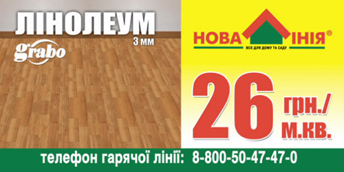 В марте 2008 года "Новая Линия" предлагает качественный бытовой, гетерогенный венгерский линолеум Grabo толщиной 3мм (на вспененной основе) всего по 26грн за кв.метр.