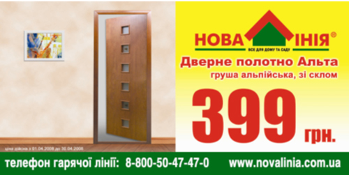 Только в сети гипермаркетов «Новая линия» в апреле месяце, Вы сможете приобрести дверное полотно «Альта» - груша альпийская со стеклом всего за 399 гривень.