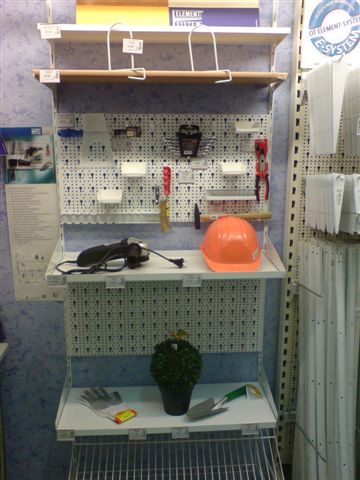 Элемент систем - Как бы эти стеллажи смотрелись в мастерской? Что бы лежало на полках? Сложно ответить... Но продавец отдела двери Наталья Шмакова заметила, помогла нашим посетителем разобраться. Однажды во время утреннего наведения порядка в секции она заметила, что презентация товара не дает возможности покупателю представить применение товара. Я поставила себя на место покупателя. Представила как бы это смотрелось в мастерской, сама пошла выбрала в инструменте необходимое, выставила и расставила ценники. Посетители довольны, им сразу все понятно.