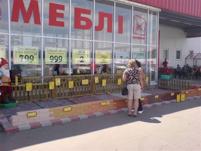 Экспозитор с тротуарной плиткой - во время обхода торгового центра директор в двух разных местах торгового зала услышал вопросы покупателей к продацу "А где у Вас тротуарная плитка?" "А у Вас есть в продаже тротуарная плитка?" Сразу после этого родилась идея создания интересной выкладки на фасаде этого продукта, для того, что бы каждый покупатель понимал что у нас есть тротуарная плитка и её можно приобрести на Строительном дворе. Сейчас начинается очередной дачный сезон, а одесситы кроме перекопаной под картошку и лук земли на "фазенде" (так у нас шутя называют дачные участки) хотят видеть красивые дорожки и огороженые грядки.