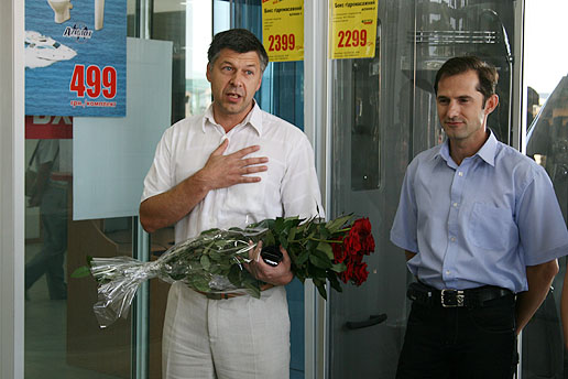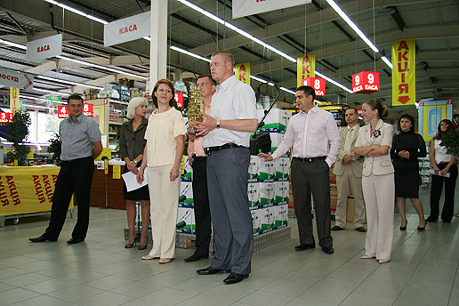 С теплым приветствием обратился к собравшимся директор магазина-юбиляра Андрей БАГИНСКИЙ. На правах «хозяина» праздника он первым поздравил свой коллектив и, дирижируя процессом, приглашал к слову коллег, специально приехавших по случаю торжества из других торговых центров «Новой линии» Киева и представителей центрального офиса.