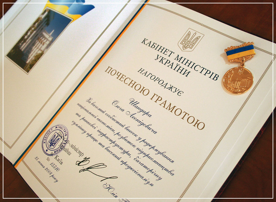 25 июля в Кабинете Министров Украины Премьер-министр Украины Юлия Тимошенко наградила Главу Правления ЗАО «Новая Линия» Шандар Олега Леонидовича почетной грамотой Кабинета Министров Украины и памятным знаком.