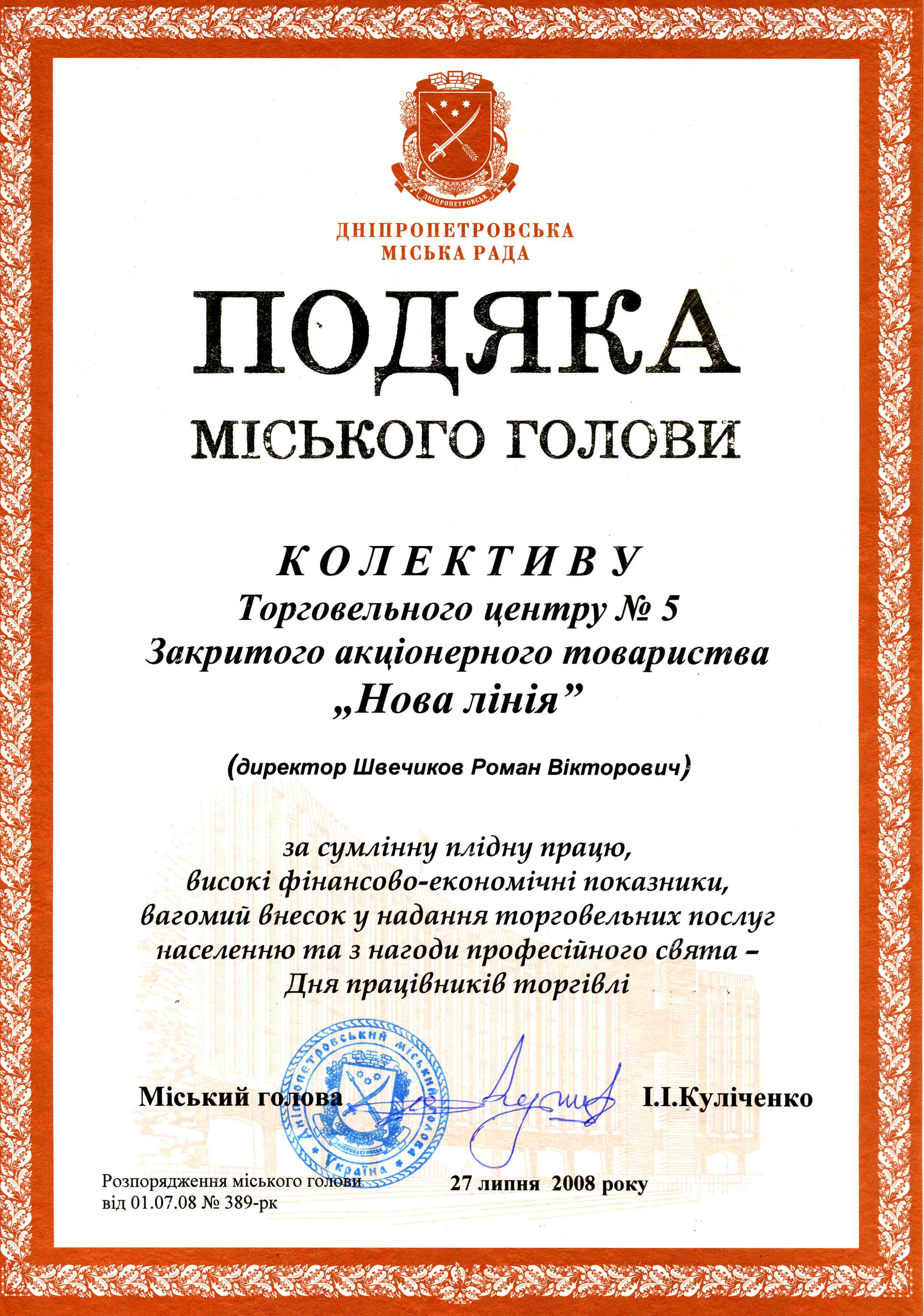 На собрании городского головы , посвящённого "Дню работника торговли" были награждены лучшие коллективы города Днепропетровска . «Новая Линия» была признана одним из лучших предприятий.Мэр города наградил почетной грамотой компанию «Новая Линия», за вклад в развитие города, за развитие цивилизованной торговли и высокие стандарты обслуживания.