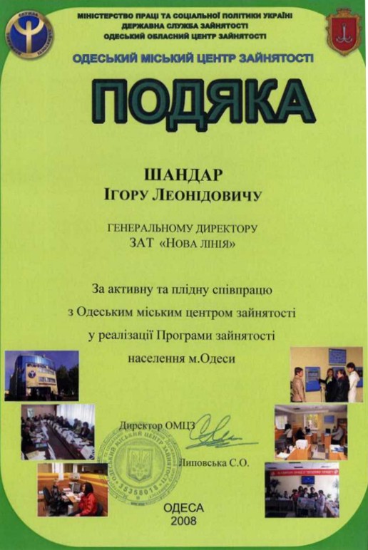 17.09.08. г. в День HR-менеджера "Дому труда" Одесскому Городском Центру Занятости исполняется 1 год. Среди гостей на этом празднике, где представляли себя крупнейшие предприятия, была представлена компания "Новая линия". Сотрудничество с центром занятости было отмечено торжественным вручением "Благодарности" от администрация за активное сотрудничество в реализации программы занятости населения г.Одессы и Одесской области.