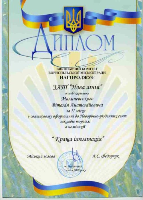 «Новая Линия» была награждена почетным 2-ым местом в номинации "Лучшая иллюминация" торгового центра. Вручал диплом лично мэр города Борисполь - Федорчук Анатолий Соловьевич.