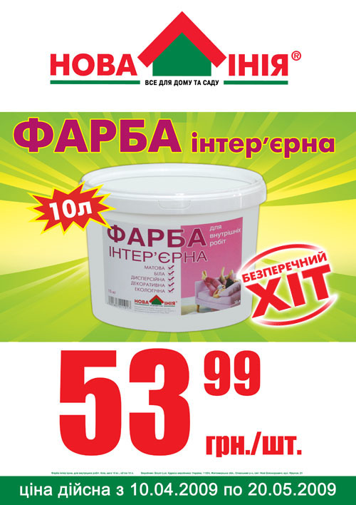 Национальная сеть строительных гипермаркетов «Новая Линия» предлагает эксклюзивную интерьерную водно-дисперсионную краску белого цвета. Эта краска изготавливается специально для ЗАО «Новая Линия» и продается только в гипермаркетах «Новая Линия».