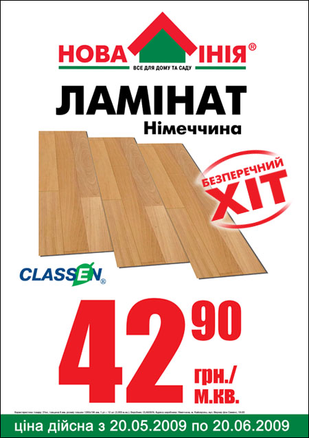 Национальная сеть строительных гипермаркетов «Новая Линия» предлагает Вашему вниманию Ламінат CLASSEN, Германия по специальной цене 42,90 грн. за м.кв.