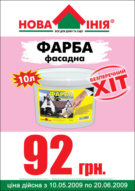 Национальная сеть строительных гипермаркетов «Новая Линия» предлагает эксклюзивную фасадную краску всего за 92 грн. за 10л. Эта краска изготавливается специально для ЗАО «Новая Линия» и продается только в гипермаркетах «Новая Линия».