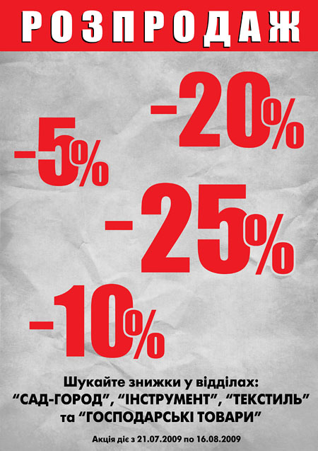 В распродаже принимает участие товар отделов «Сад-огород», «Инструмент», «Хозяйственные товары» и «Текстиль».
