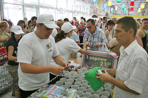 - Посетители гуляли длинными рядами гипермаркета, изучали ассортимент, качество и были приятно удивлены ценовой политикой компании. В этот день покупки совершали все! Даже те, кто просто пришел посмотреть на наш гипермаркет, не смогли уйти с пустыми руками. Ведь каждый покупатель получил памятный подарок, и моментально становился участником розыгрышей призов, которые проходили на площадке возле гипермаркета каждые 45 минут. А самые активные посетители принимали участие в веселых конкурсах и викторинах.