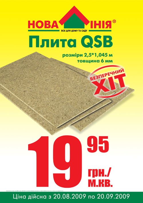 Национальная сеть строительных гипермаркетов «Новая Линия» представляет Плиту QSB Kronospan s.r.o., по суперцене 19,95 грн. за м.кв, 52,12 грн. за лист, производства Словения.