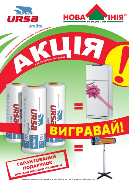 Вам нужно приобрести изоляционные материалы? Тогда Вам повезло! Ведь именно сейчас в национальной сети декоративно-строительных гипермаркетов «Новая Линия» проходит акция совместно с ТМ «URSA». Купив три любые упаковки изоляционных материалов «УРСА» Вы автоматически становитесь участником розыгрыша двух электрических обогревателей и одного двухкамерного холодильника. И это еще не все. Каждый покупатель гарантированно получает нож для нарезки стекловаты в подарок.