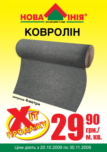 Национальная сеть декоративно-строительных гипермаркетов «Новая Линия» представляет хит сезона – ковролин по символической цене 29,90 гривен за метр квадратный.