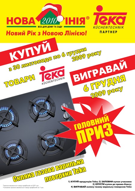 Нужна газовая варочная поверхность? Приходите в национальную сеть декоративно-строительных гипермаркетов «Новая Линия». Только с 30 ноября по 06 декабря 2009 года и с 21 декабря по 27 декабря 2009 года при покупке любой продукции ТМ «Тека» Вы становитесь участником розыгрыша газовой варочной поверхности.
