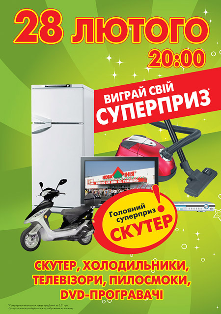 А 28 февраля в 20.00 состоится розыгрыш суперпризов: DVD плееры пылесосы, холодильники, LCD телевизоры и скутер, в котором смогут принят участие все посетители «Новой Линии» которые 27 и 28 февраля совершили покупки, а в 21.00 начнется фантастическое шоу фейерверков.