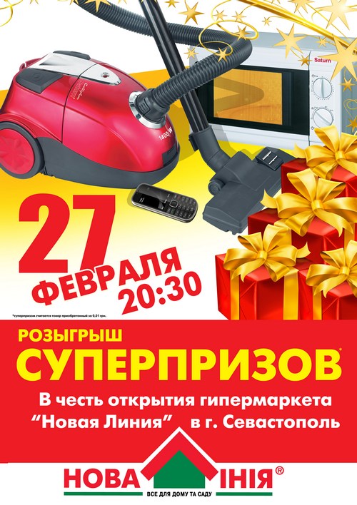 27 февраля, каждый час с 9.00-20.00, в торговом центре «Новая Линия» Симферополь, для всех покупателей будут проходить розыгрыши призов. А вечером, в 20.30, состоится розыгрыш суперпризов!