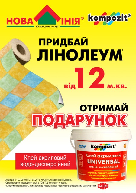 Только с 1 по 31 марта 2010 года, только в сети декоративно-строительных гипермаркетов «Новая Линия» в Киеве и Киевской области, при покупке линолеума Вы получаете клей в подарок.