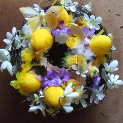 Венок пасхальный бывает настольный, настенный и подвесной. Он символизирует бесконечность, вечную жизнь и собирается из весенних цветов и веток, с яйцами, скорлупой, лентами, перьями и другими атрибутами. Используется в качестве украшения интерьера и как пасхальный подарок.