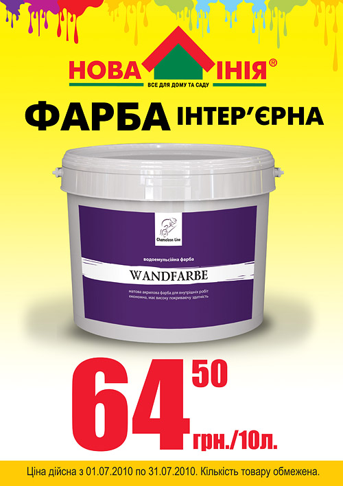 Национальная сеть декоративно-строительных гипермаркетов «Новая Линия» представляет краску Хамелеон по суперцене 64,50 гривен за 10 л