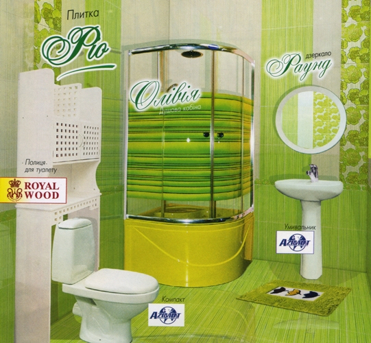 Коллекция керамической плитки «Рио», оригинальные яркие декорирующие элементы, выраженный стиль и безупречное качество исполнения керамической плитки «Голден Тайл», создают в ванной комнате атмосферу тропических красок. А компакт с умывальником «Азимут» и душевой кабиной «Оливия» дополнят картину ванной комнаты удобством и надежностью.