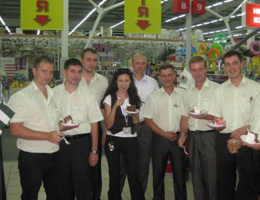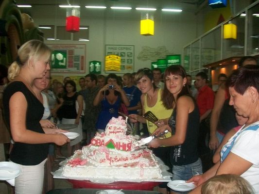 Коллектив торгового центра собрался в фойе для дружного празднования годовщины дня открытия. Все сотрудники с превеликим удовольствием принялись лакомиться подаренным именным десертом.
