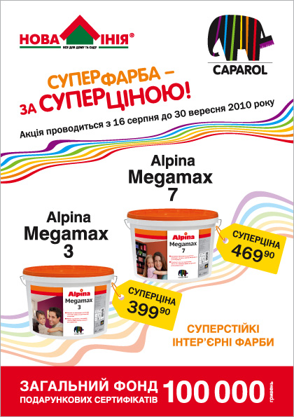 Купите акционную краску «Caparol» Alpina Megamax 3 или «Caparol» Alpina Megamax 7 по одному чеку и выиграйте сертификат на покупку любой продукции ТМ «Caparol»!