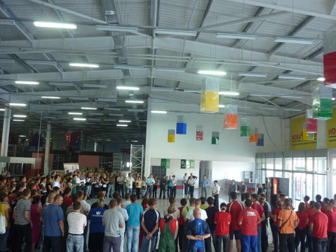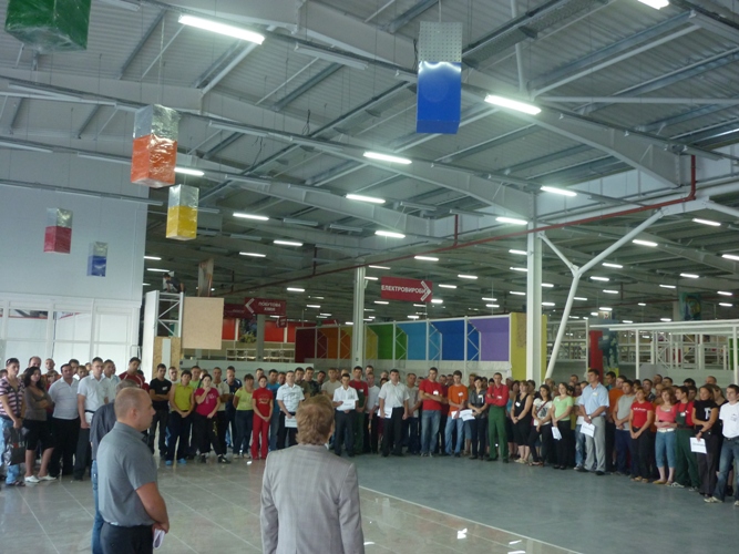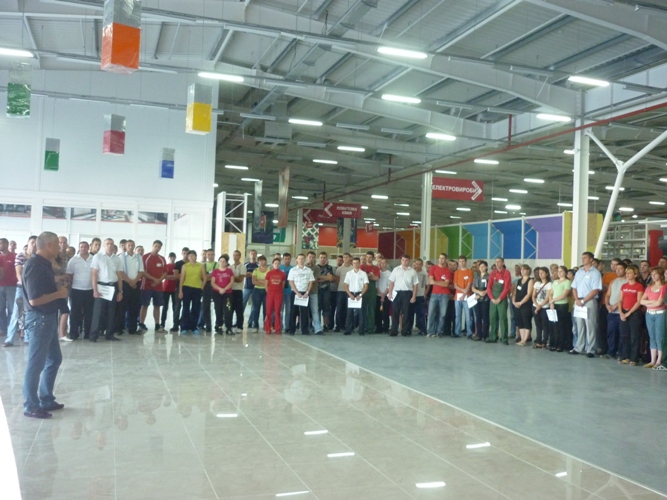 Персонал гипермаркета, состоящий из более 400 человек, собрался в фойе для торжественного приветствия главы правления АО «Новая Линия» Олега Леонидовича Шандара, Директора операционного департамента Александра Проценко и директора торгового центра Воротова Вадима.