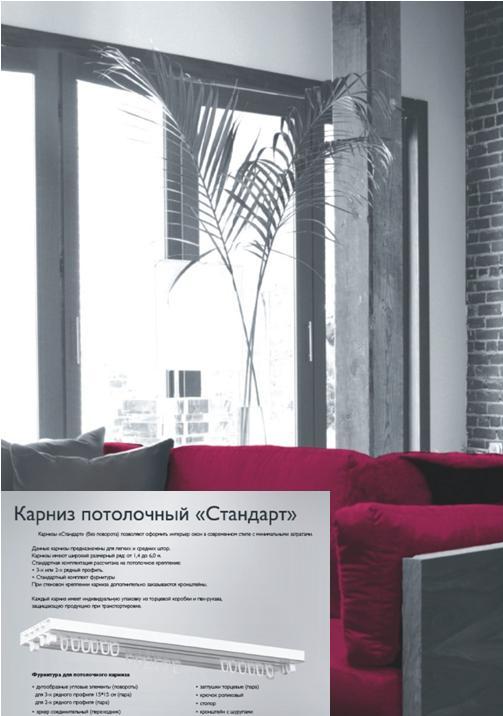 Все карнизы имеют изысканную индивидуальную упаковку и укомплектованы полным набором фурнитуры для потолочного крепления. В последнее время, все больше людей, при декорировании окон шторами, предпочитают использовать пластиковый профиль, это модно, современно и практично. В отличие от круглых карнизов - пластиковый профиль отвечает требованиям современных дизайнов помещений. По сравнению с алюминиевым, он белого цвета, и отлично сочетается с цветом отделки потолка помещений.