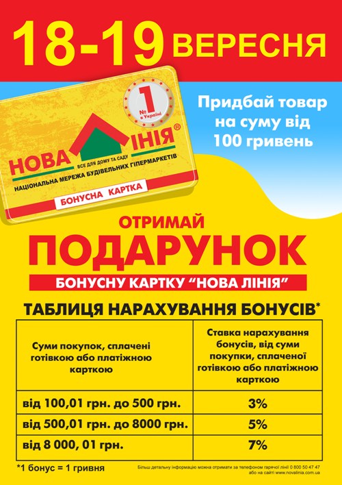 В честь Дня Рождения города, только 18 и 19 сентября, каждый кто совершит покупку свыше 100 гривен, станет владельцем бонусной карточки «Новая Линия» со специальными условиями экономии!
