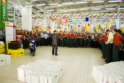 Перед началом рабочего дня всех работников торгового центра поздравил директор гипермаркета Галай Александр Валериевич.