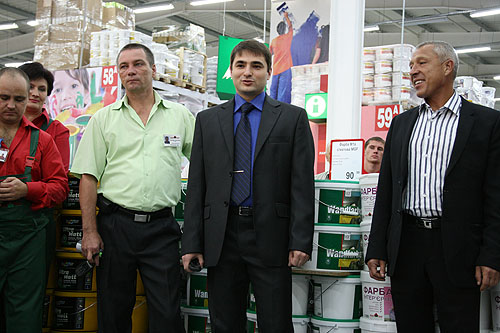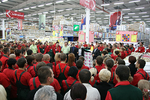 Перед открытием торгового центра Глава Правления компании "Новая Линия" Олег Леонидович Шандар, Директор нового торгового цетра в г. Одесса Вадим Владимирович Воротов, а также Директор торгового центра в г. Запорожье Владимир Алексеевич Котляренко сказали слова наставления и пожелали хорошего старта персоналу нового гипермаркета в г. Одесса.