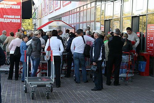 За пол часа до открытия возле входа в торговый центр собралось более двух сотен посетителей, которые с нетерпением ждали открытия нового гипермаркета.