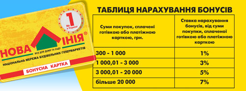 "Новая Линия" заботится о каждом покупателе и спешит сэкономить ваши деньги! Любой покупатель, который совершил покупку от 300 грн имеет возможность получить бонусную карту. Для этого вам необходимо, при покупке в ТЦ "Новая Линия" сохранить полученный чек, и в течение 30 календарных дней от даты осуществления покупки, предоставить его сотрудникам отдела безналичного расчета, где вы сможете получить бонусную карточку "Новая Линия". При этом покупателю необходимо предоставить паспорт или любой другой документ удостоверяющий личность.