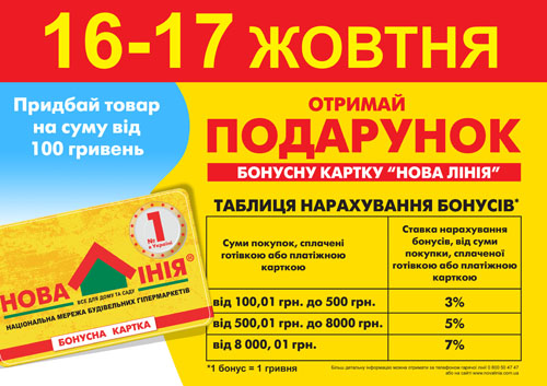 При покупке товара на сумму от 100 грн у Вас есть возможность получить бонусную карточку и стать полноправным членом клуба «Новая Линия»!