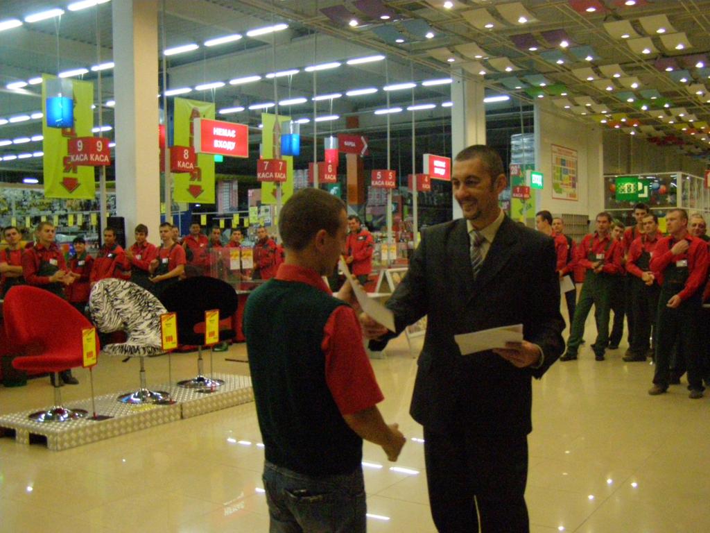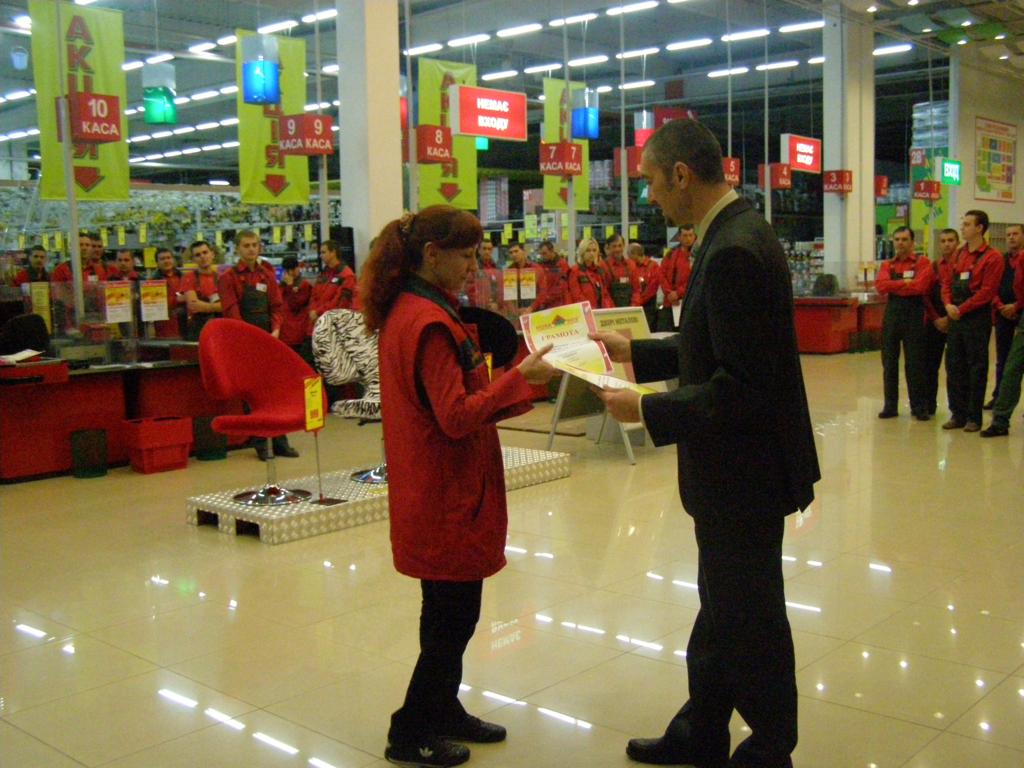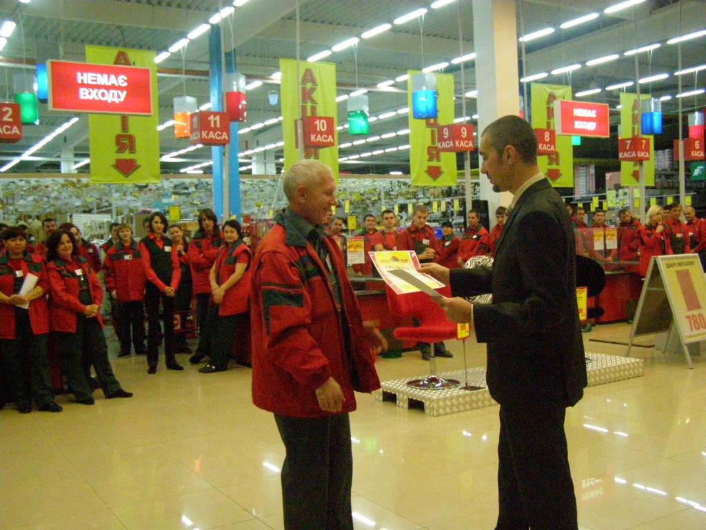 Директор торгового центра, Галик Александр Олегович, поздравил весь коллектив и вручил работникам грамоты и благодарности за достигнутые успехи в профессиональной деятельности и по случаю 2-ой годовщины открытия. Приятно отметить, что в одном из самых больших по площади и количеству работников гипермакете, большая часть персонала работает еще с открытия, а, как известно, в дружном и большом коллективе легко и с удовольствием работается.