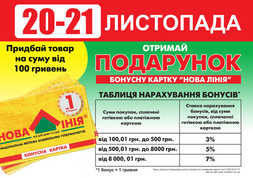 Каждый покупатель, который совершит покупку 20 и 21 ноября в декоративно-строительном гипермаркете «Новая Линия» на сумму от 100 грн, получит в подарок* бонусную карточку со специальными условиями начисления бонусов*.