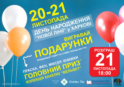 У всех, кто совершит покупку в Новой Линии 20 и 21 ноября на сумму от 400 грн, получает замечательную возможность поучаствовать в розыгрыше ценных призов и подарков. Розыгрыш призов состоится 21 ноября в 18-00 в фойе гипермаркета. У каждого покупателя есть замечательная возможность выиграть в подарок утюг, миксер, фен для сушки волос или же набор полезных книг. Главный приз- коллекция кафеля - Вельвет*.