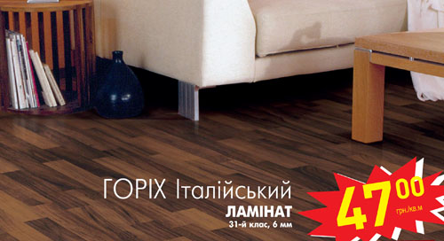 Ламинат «Итальянский орех», по цене 47 грн м2, производства Германии - отличное решение для тех, кто любит контрастные цвета в своей квартире. Расцветка ламината имитирует паркет, пол с таким покрытием приобретает красивый темный ореховый цвет.