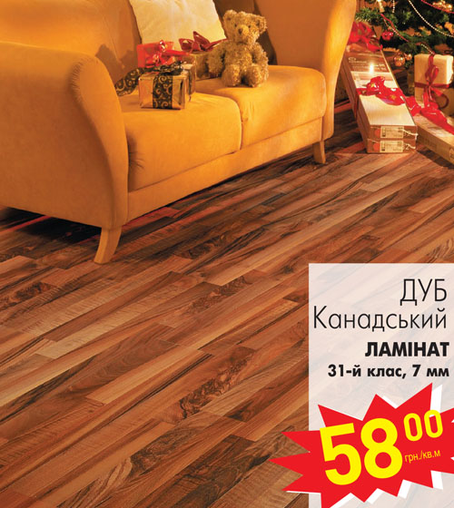 Ламинат «Канадский дуб», по цене 58 грн м2, производства Германии идеально подойдет для гостиной или же спальни.