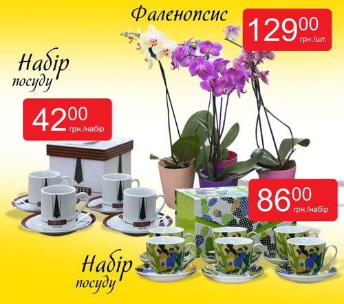Женщин можно порадовать банными наборами всего за 37 грн, наборами посуды – от 86 грн. Отличным подарком близким и родным в холодные зимние дни станет цветущая орхидея в горшке за 129 грн или же символ Рождества - пуансетия или же, в простонародье Рождественская Звезда, всего за 11.50, которая украсит любой новогодний стол.