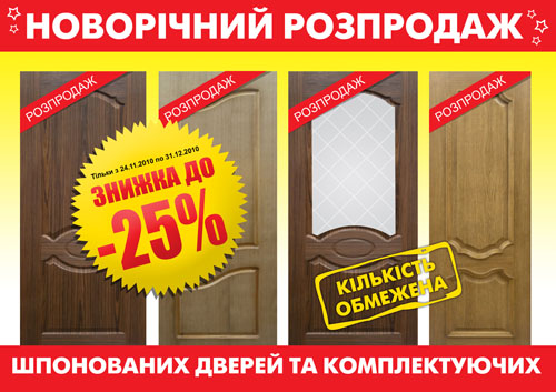 В декабре 2010 года национальная сеть декоративно-строительных гипермаркетов «Новая Линия» объявляет о новогодней распродаже шпонированных дверей и комплектующих к ним!