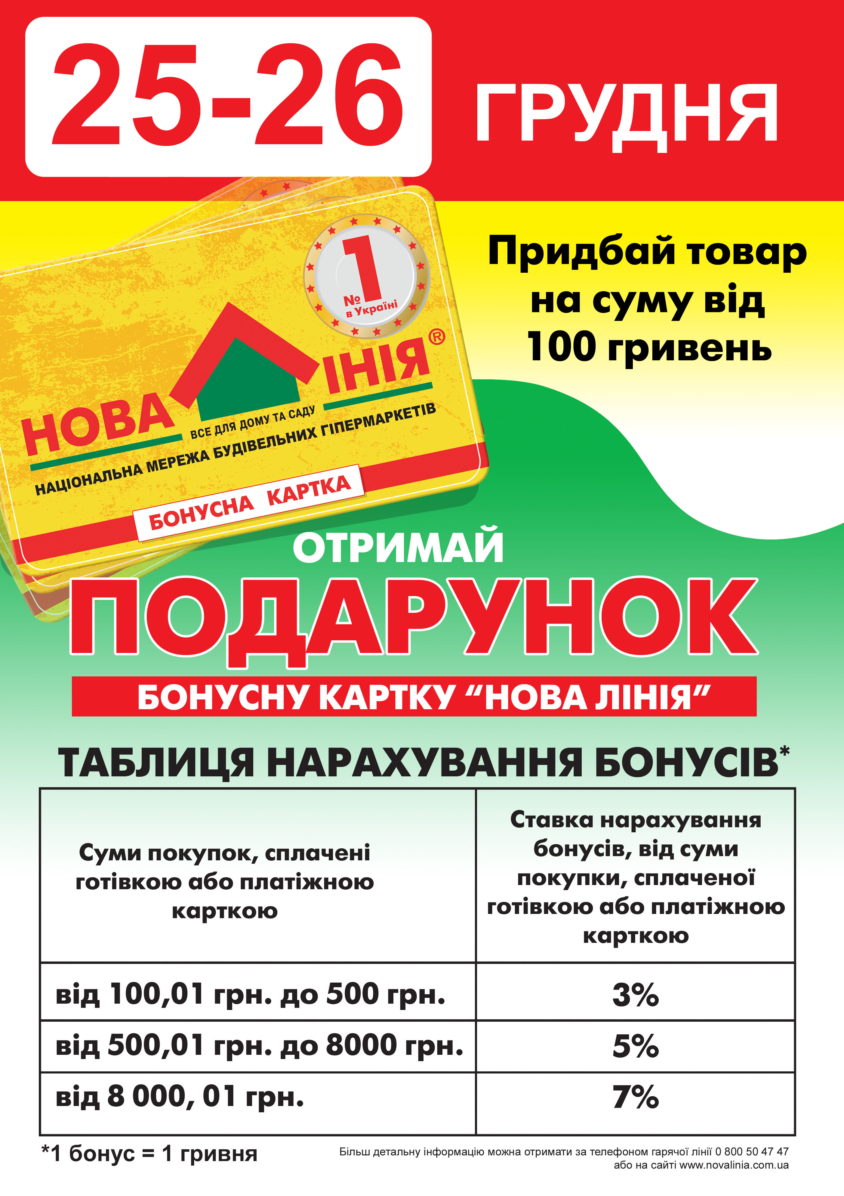 Если же сумма чека превышает 100 грн, у Вас есть замечательная возможность получить бонусную карточку** и стать полноправным членом клуба «Новая Линия» с уникальной системой начисления бонусов! Делайте покупки, пользуйтесь бонусной карточкой и экономьте свои деньги!