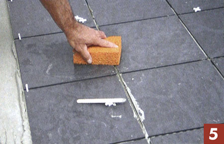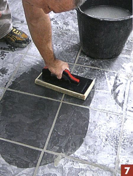 7. Когда раствор для затирки швов начнет подсыхать, начинайте удалять с поверхности плитки цементный шлам, используя для этого дощечку с губкой и большое количество воды.