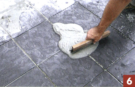 6. После того как клей для укладки керамической плитки высохнет (приблизительно через 24 часа), нанесите раствор для затирки швов и вотрите его в швы с помощью резинового шпателя попеременными движениями вдоль шва и по диагонали. Швы затирают, не оказывая сильного давления.