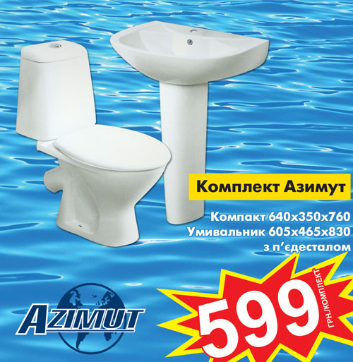 Для любителей классики рекомендуем приобрести комплект Азимут, который состоит из умывальника с пьедесталом и компакта. Такой комплект в феврале в «Новой Линии» можно будет купить всего за 599 грн.