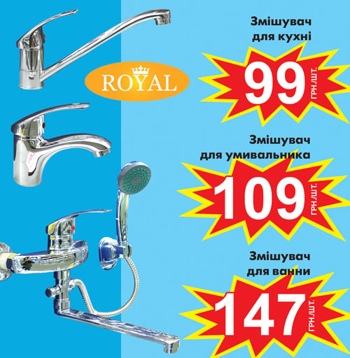 Смесители Royal– отличное решение для ценителей красоты, классики и высокого качества. Цены на предлагаемые смесители приятно удивят и порадуют Вас - ведь только в феврале смеситель для ванной можно приобрести всего за 147 грн, а смеситель для умывальника стоит всего 109 грн.