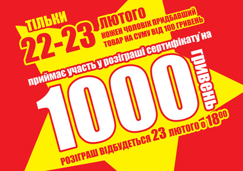 Каждый мужчина, который совершил любую покупку в гипермаркетах «Новая Линия» 22 или 23 февраля на сумму от 100 грн может принять участие в розыгрыше и выиграть 1000 грн!
