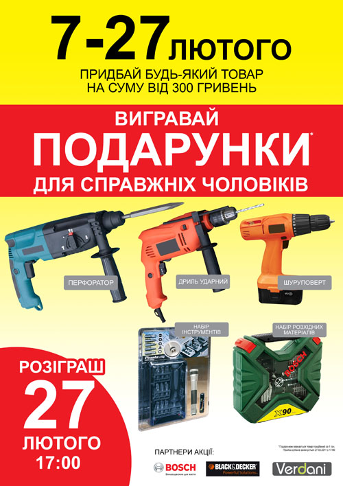 В период с 07 по 27 февраля совершайте любые покупки в сети гипермаркетов «Новая Линия» на сумму от 300 грн. и участвуйте в розыгрыше ценных подарков. Наборы инструментов Black & Decker, перфораторы Hammer, дрели, шуруповерты и еще много ценных и незаменимых для работы по дому подарков ждут Вас!