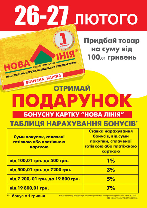 Стать участником акции и получить подарок может каждый покупатель, который 26.02.2011 по27.02.2011г совершит покупку в гипермаркете «Новая Линия», свыше 100 грн. и оплатит ее наличными или по кассовому терминалу. Подтверждением участия в акции есть кассовый чек на сумму покупки от 100 грн.