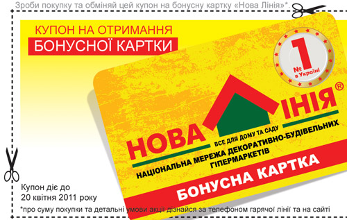 Уважаемые покупатели! 23.03 по 20.04. 2011 года у Вас есть возможность получить бонусную карточку «Новая Линия» с особыми условиями начисления бонусов. Вырежьте купон на получение бонусной карточки из периодического издания*, посетите один из гипермаркетов «Новая Линия» в своем городе, совершите покупку** и обменяйте купон и чек на бонусную карточку с особыми условиями начисления бонусов.
